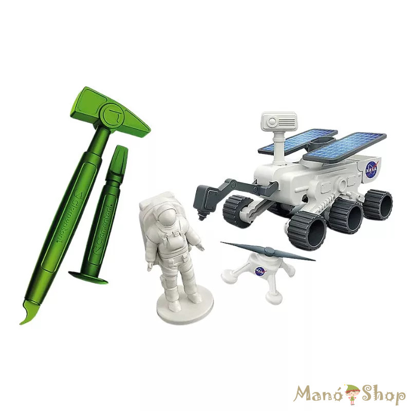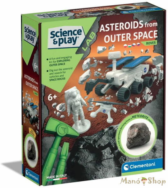 Egy titokzatos, világűrből származó kőzet landolt a Földön. Mi lehet ez, és vajon mit rejt? Lehet, hogy egy távoli, idegen civilizáció üzenete, vagy egy aszteroida darabja, amely a Mars vagy a Jupiter pályája közötti aszteroidaövből jött, ahonnan a legtöbb égitest származik. A kalapács és a véső segítségével tárhatják fel a gyerekek ezeket az izgalmas dolgokat. Az Aszteroidák a világűrből tudományos játékkészletben található gipsztömb számos izgalmas dolgot rejt. Óvatos felaprózása után egy űrjáró alkatrészeire, egy asztronautára, drónra és kőzetmintára bukkannak a gyerekek. Addig kell folytatni az ásatást, amíg minden része elő nem kerül a játéknak. A munkát nagyon óvatosan és odafigyelve kell elvégezni, hogy ne sérüljenek az alkatrészek és elemek. Az űrjárót, a drónt és az asztronautát az útmutatóban leírtak alapján lehet összerakni. Mivel az űrkőzet gipszből, habkőből és homokból áll, nem kell nagyon nagy erőt kifejteni ahhoz, hogy eltöredezzen a tömb. A finomabb, apróbb felfedést végezheti a gyermek fogpiszkálóval, ecsettel, használaton kívüli fogkefével. A színes, lépésről-lépésre útmutató füzet nagyon pontos leírást tartalmaz, emellett pedig számtalan érdekességet olvashat a gyermek az űrjárművekről, kőzetekről és az eddigi felfedezésekről. Izgalmas, az űrhajózással kapcsolatos informatív, kézügyességet fejlesztő játék az olasz Clementoni játékgyártótól.