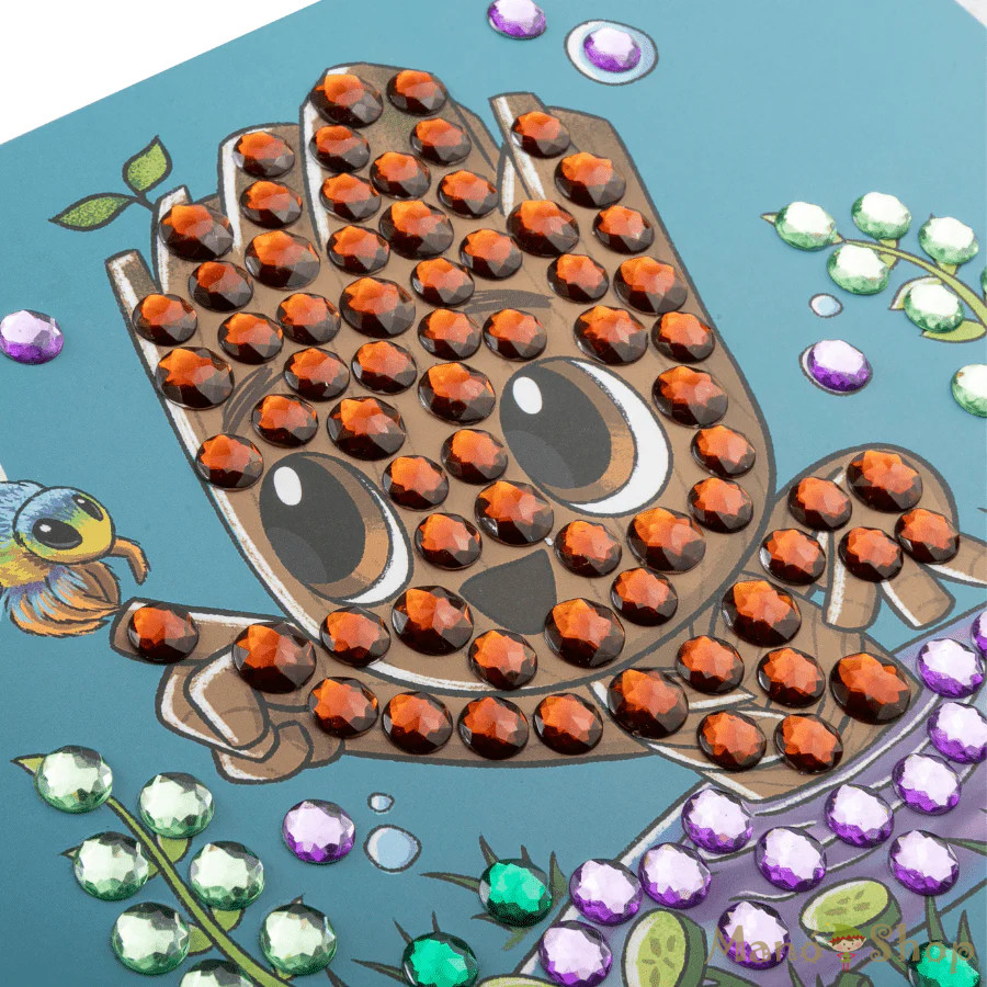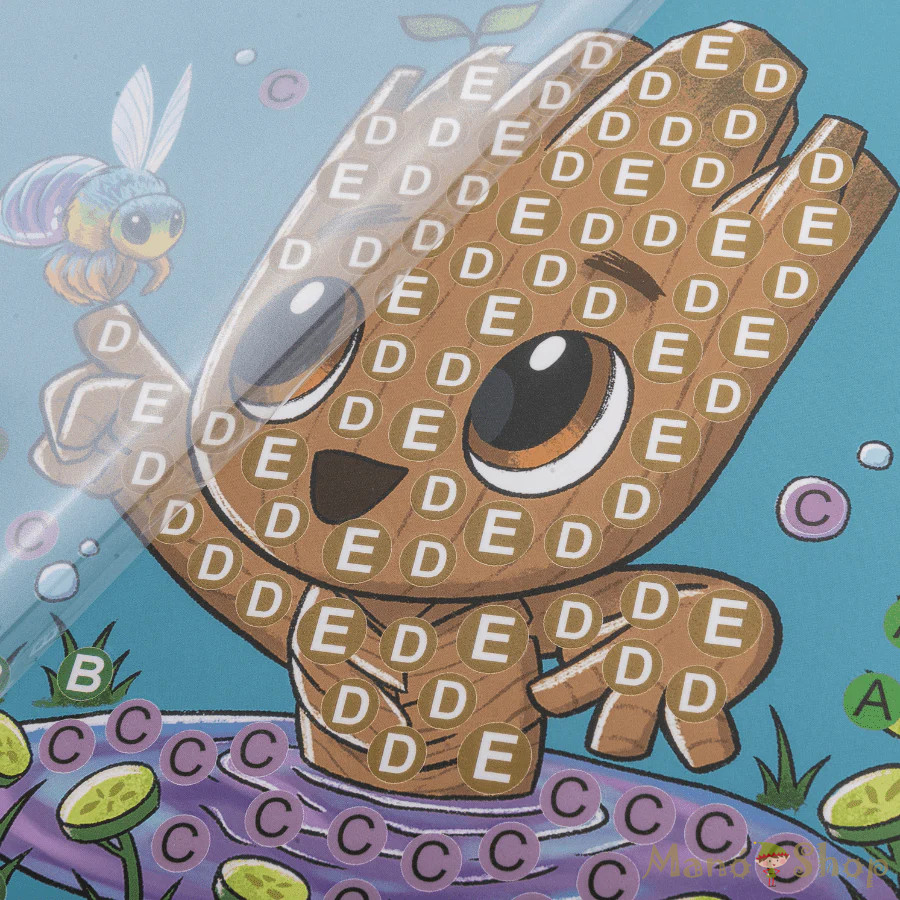 A gyerekek egyszerűen, játékos módon készíthetik el saját Groot képüket: csak illesszék a nagy méretű (10–12 mm-es) kristályokat a megjelölt pontokra az öntapadós vásznon, és máris ragyogni fog ez az ikonikus Marvel-karakter. A kész mű könnyen kiakasztható a gyerekszoba falára.