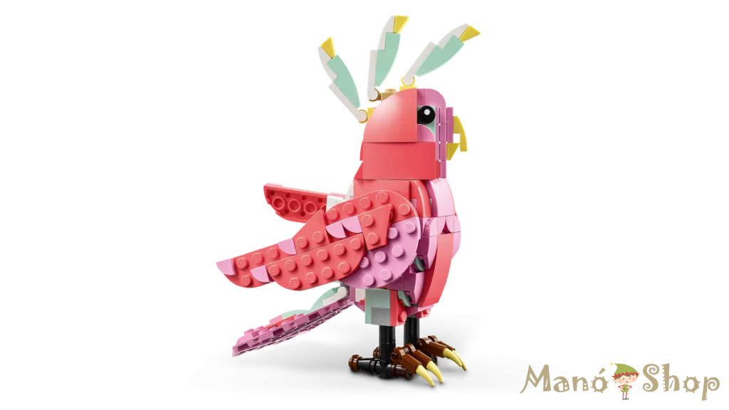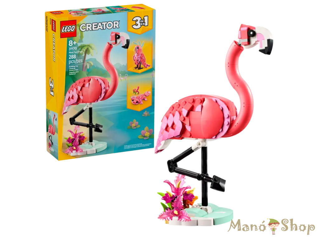 Szerezz örömet a 8 éves vagy nagyobb, állatbarát lányoknak és fiúknak a fantasztikus LEGO® Creator 3 az 1-ben Vadállatok: rózsaszín flamingó (31170) játékkészlettel! A játék flamingó feje beállítható, és egy növényekkel borított, kicsi állványon pihen, így a gyerekek hosszú órákon át játszhatnak vele és ki is állíthatják a szobájukban. Ennek LEGO szettnek a kockái 3 különböző építési lehetőséggel várják a gyerekeket: növényekkel borított állványon pihenő, rózsaszín játék flamingó beállítható fejjel; beállítható, rózsaszín kakadu 360 fokban elforgatható fejjel; beállítható, rózsaszín, aranyos kis játék axolotl tengeri növényekkel. Mindhárom, átalakítható, aranyos LEGO állat szuper ajándék lesz a gyerekek számára. A LEGO Creator 3 az 1-benszettek minden dobozban 3 különböző, megépíthető modellel inspirálják a gyerekek képzelőerejét! Imádni fogják majd a megépítést, az átépítést és az újraépítést. A 3 az 1-ben készletek olyan modellválasztékot kínálnak, amellyel a gyermekek hódolhatnaka legfőbb szenvedélyeiknek, mint például a szupergyors járművek, a lenyűgöző állatok vagy a részletgazdag házak. Egyszerre csak egy modellt lehet megépíteni! 3 vadállatot építhetsz 1 dobozból – A LEGO® Creator 3 az 1-ben Vadállatok: rózsaszín flamingó játékszettel a 8 éves vagy nagyobb lányok és fiúk 3 különböző állatfigurát építhetnek meg, és építhetnek át ugyanazokból a kockákból Végtelen sok játéklehetőség – A gyerekek 3 különböző állatmodellel játszhatnak el történeteket (a modelleket csak külön-külön lehet megépíteni): egy rózsaszín, játék flamingóval, egy rózsaszín, játék kakaduval vagy egy axolotlfigurával Beállítható LEGO® állatfigurák –Mind a 3 színes modellnek beállítható végtagjaik vannak, például feje és lába, így a gyerekeknek fantáziadús játékban lesz részük; a kakadufigurának pedig 360 fokban körbeforgatható a nyaka Állatos LEGO® szett, amit megépíthetsz és kiállíthatsz –Az állatfigurák remekül mutatnak majd a gyerekek hálószobájának polcán vagy éjjeli szekrényén Állatos LEGO® ajándék gyermekeknek – Ez a 3 az 1-ben építőjáték magával ragadó építési és játékélményt nyújt, és egyben remek meglepetés lesz azoknak a gyerekeknek, akik szeretik az állatokat Még vidámabb 3 az 1-ben szórakozás – Még több kaland vár a gyerekekre az igen széles LEGO® Creator 3 az 1-ben választék többi készletével (külön kaphatók) LEGO® Creator játékok – Minden (külön kapható) 3 az 1-ben készlettel a gyermekek 3 különböző modellt építhetnek meg, amiket a legfőbb szenvedélyeik inspiráltak, a modellek közt állatok, járművek és házak találhatók Méretek – Ez a 288 darabból álló, átépíthető LEGO® játékszett tartalmaz egy 23 cm magas, rózsaszín flamingójátékot