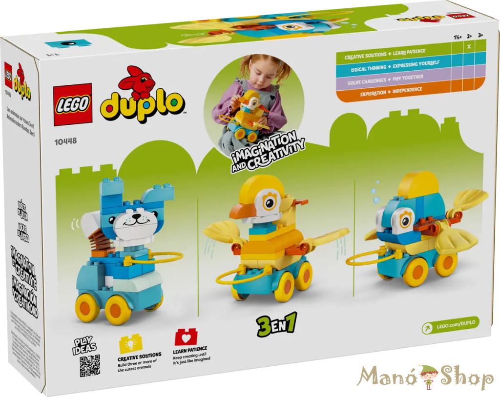 Inspiráld a kisgyermekek kreativitását a 3 az 1-ben guruló állatok (10448) építőjátékkal! A kis állatrajongók sokféle módon élvezhetik a fantáziadús játékot, miközben megépítik az óvodásoknak készült játék kacsát, halat és kutyát, de teljesen új állatokat is kitalálhatnak! Az óvodáskorú gyermekek, akik imádják a járműves LEGO® DUPLO® játékokat, kerekes alaplapra építhetik a figurákat, hogy azok száguldhassanak, vagy hogy egy fogantyúval húzhassák őket. A kisgyermekeknek szóló ajándéknak csuklópántos és mozgó elemei (például rugalmas farokelem) vannak, amelyek nagyon szórakoztatók a kisgyermekek számára, és fejlesztik a finommotoros készségeiket. A kicsik mozgásba hozzák a koncentrációjukat, a kitartásukat és a képzelőerejüket, miközben vég nélkül építik meg és át a kreatív játék állatokat. Ez a kisgyermekjáték rengeteg, játékosan fejlesztő pillanattal vár. Ehhez a 3 az 1-ben LEGO DUPLO szetthez könnyen kezelhető elemek tartoznak, amelyeket könnyen szét lehet szedni, és segítenek a kicsiknek megtanulni, hogyan építsék meg a figurákat úgy, hogy egyensúlyban legyenek a kerekeken, és ne dőljenek el. 58 építőelemmel. Építőjáték az órákon át tartó, fantáziadús játékért – Csempéssz színt és határtalan kreativitást a kisgyermekek játékidejébe a LEGO® DUPLO® Városi kalandok 3 az 1-ben guruló állatok építőjátékkal! Kreatív játék végtelen sok játéklehetőséggel – Az 58 kisgyermekbarát kockával a kis óvodások 3 játék állatot építhetnek: kacsa-, hal- és kutyafigurát, vagy bármilyen más állatot, amit csak ki tudnak találni A mozgó részek fejlesztik a finommotoros készségeket – A kicsik csapkodó uszonyt, verdeső szárnyat, forgó nyakat és olyan dinamikus részleteket adhatnak a játék állatokhoz, amelyeket örömmel fedeznek majd fel az apró ujjak Fejlesztőjáték óvodásoknak – Ez a 3 az 1-ben játék segít a kisgyermekeknek fejleszteni a kreativitásukat, az egyensúlyérzéküket, a nagy- és finommotoros készségeiket, sőt, a színeket is tanulhatják Ajándék kisgyermekeknek – Ez a fejlesztő LEGO® DUPLO® gyermekjáték csodálatos ajándék lehet születésnapra vagy egy különleges alkalomra, de szimpla meglepetésnek is tökéletes olyan 2+ éves gyerekeknek, akik imádják a járműveket és a játék állatokat Digitális építési útmutató – A LEGO® Builder app az óvodásoknak szóló játékban található útmutató digitális változatát tartalmazza. A készletet szigorúan teszteltük, hogy biztonságos játékélményt nyújtson Játékok, amelyek játékos tanulásra hívják a gyermekeket – A kisgyermekeknek készült LEGO® DUPLO® fejlesztőjátékok segítenek az óvodásoknak fejleszteni az életben fontos készségeket, és felkészítik őket az élethosszig tartó tanulás kalandos útjára Méretek – Az 58 darabból álló építőjáték óvodásoknak készült kutyafigurája 21 cm magas
