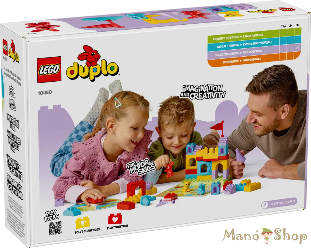 Vidám családi órák várnak rád és a kisgyermekedre, miközben segítesz nekik a játékos tanulásban a LEGO® DUPLO® Játék Hoppszi kastélyával (10450) 2 az 1-ben társasjátékkal. A 2 szórakoztató játékkal a kisgyermekek LEGO DUPLO fejlesztőkalandokra indulnak, amelyek során számolni tanulnak, és fejlesztik a színválogató készségüket. A kisgyermekek először a számoló és színfelismerő készségeiket használják, hogy egy kreatív játék kastélyt építsenek. Ez a vidám családi tevékenység úgy indul, hogy mindegyik játékos választ egy játék állatot, majd megpörgeti a nyilat, hogy kiderüljön, mennyit léphet a táblán. A játék akkor ér véget, ha minden figura a kastélyhoz ért. A 2. játékban a kisgyermekek színválogató készségük segítségével megépítik a legmagasabb játék tornyot. A játékosok megpörgetik a nyilat, hogy lássák, milyen színű kockákat kell az építőjátékhoz hozzáilleszteni. Ez a fejlesztőjáték temérdek fejlesztőtevékenységgel vár, például megtanítja, hogy a játékosok felváltva következnek, fejleszti a képzelőerőt és a finommotoros készségeket, a kastély építése során pedig támogatja a csapatmunkát. 47 elemből áll. Játékos tanulást támogató építőjáték – Élvezd a vidámsággal teli családi tevékenységeket az óvodáskorú gyermekeknek készült LEGO® DUPLO® Játék Hoppszi kastélyával 2 az 1-ben fejlesztőtársassal! Rengeteg funkció támogatja a játékos készségfejlesztést – A játék egy pörgettyűt, egy játéktáblát, 3 állatfigurát, valamint 47 kockát és elemet tartalmaz, amelyekből vidám játék kastélyokat lehet építeni Szórakoztató társasjáték az egész családnak – Ebben az építőjátékban 2 játékot találsz, amelyek segítségével a kisgyermekek megismerkednek a számokkal és a színekkel, továbbá megtanulják, hogyan következnek egymás után a játékosok Fejlesztőjáték óvodásoknak – Ez a fejlesztőjáték segít az óvodásoknak megtanulni, hogyan következnek egymás után a játékosok, hogyan dolgozzanak csapatként, de fejleszti a finommotoros készségeiket és a kreativitásukat is Ajándék kisgyermekeknek – Ez a magával ragadó fejlesztőtevékenység remek ajándék lehet születésnapra vagy egy különleges alkalomra olyan 3 éves vagy nagyobb kisgyermekeknek, akik szeretik a fantáziadús játékot Digitális építési útmutató – A LEGO® Builder app ennek a kreatív játéknak a dobozában található útmutató digitális változatát tartalmazza. A készletet szigorúan teszteltük, hogy biztonságos játékélményt nyújtson Fejlesztőjáték óvodáskorú gyermekeknek – A fantáziadús LEGO® DUPLO® játékszettek tanulással teli kalandra viszik az óvodásokat, fejlesztik kisgyermekkori készségeiket, és támogatják érzelmi fejlődésüket a szórakozássalteli játékidő során Méretek – Ez a 47 darabból álló játék tartalmaz egy táblát, amely 32 cm hosszú és 22 cm széles