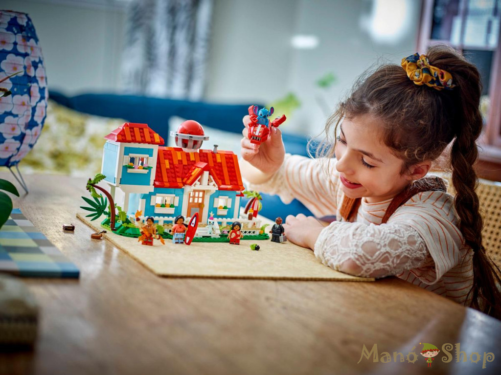 Csodálatos kalandok várnak a 9 éves vagy nagyobb rajongókra és gyerekekre a Lilo és Stitch tengerparti háza (43268) LEGO® ǀ Disney játék építőkészlettel! A szett tartalmaz egy 2-emeletes tengerpartiház-modellt, de a megépíthető Disney játék rengeteg filmes részletekkel és meglepetésekkel is vár, például 2 szörfdeszkával, Lilo babájával, Scrumppal, lemezjátszóval, befőttes üveggel és kockákból épült űrhajóval. A szetthez 5 LEGO ǀ Disney szereplő minifigurája is tartozik: David, Lilo, Kobra Bubork, Nani és Stitch, akik végtelen sok játéklehetőséggel várnak.