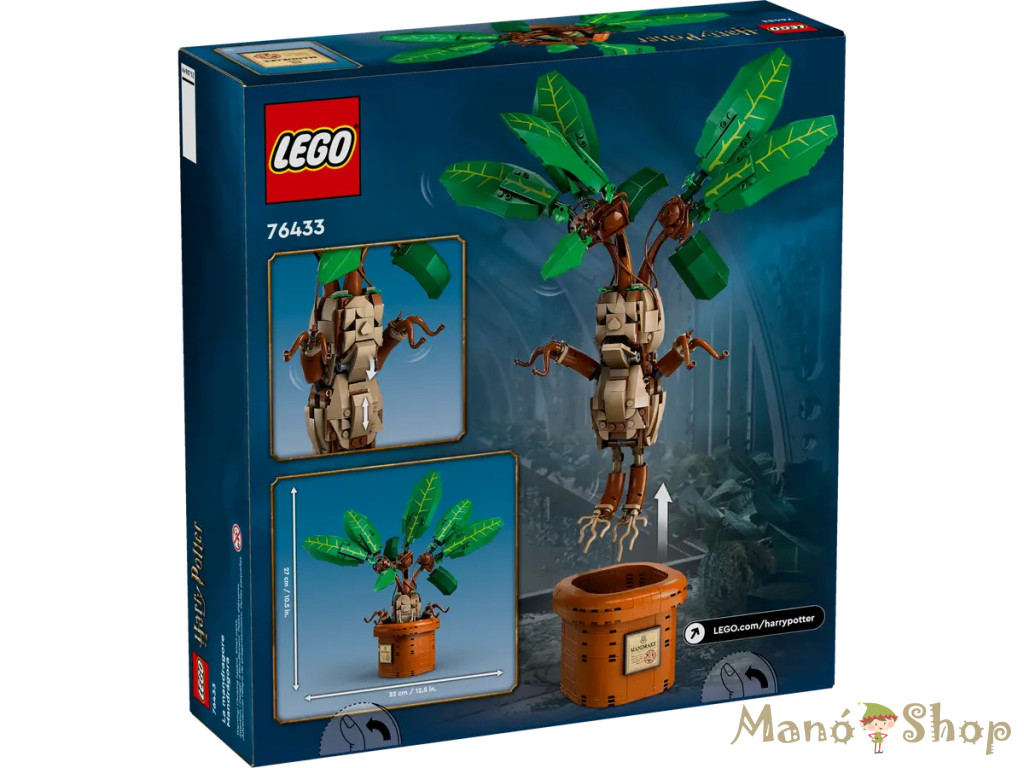 Gazdagítsd a gyerekek életét a Roxfort™ gyógynövénytanóra csodáival a LEGO® Harry Potter™ Mandragóra játék növény (76433) segítségével, amely a sikító növény első olyan figurája, amely LEGO kockákból épült! Varázslatos ajándék és lakásdekoráció a fantáziával teli lányoknak, fiúknak és 10 éves vagy annál nagyobb Harry Potter rajongóknak, hiszen a szett egy szinte életnagyságú, beállítható modelljét rejti a mandragórának, sőt, egy megépíthető cserép is a készlet része, hogy játékos kiállítási darabot lehessen készíteni. Állítsd be a mandragóra leveleit, vedd ki a cserépből, és mozgasd fel-le a mellkasát, hogy a szájával és a végtagjaival imitálja a sikítást! Tedd még izgalmasabbá a kreatív élményt a gyermekek számára a LEGO Builder appal, amellyel az építők építés közben felnagyíthatják és megforgathatják a modellek 3D-s változatát, nyomon követhetik a haladásukat és készleteket menthetnek el. Lenyűgöző lakásdekorációs ötlet, hiszen ez a szokatlan játék varázslény része a LEGO Harry Potter készletek gazdag gyűjteményének (külön kaphatók), amely végtelen sok lehetőséget kínál arra, hogy varázslatos történeteket építs meg és játssz el! LEGO® Harry Potter™ mandragóra játék növény és vidám kiállítási darab – A Roxfort™ gyógynövénytanórájáról ismert varázslatos mandragóra növény legelső, LEGO kockákból épült figurája Mágikus növény játékfigura – Állítsd ki a Harry Potter™ történetekből ismert sikító növény modelljét egy megépíthető cserépben, vagy vedd ki a cserépből a mandragórát, és játszd azt a szórakoztató játékot, hogy gondozod a növényt Egyedi játék gyerekeknek, valósághű részletekkel – Állítsd be a mandragóra leveleit, mozgasd fel-le a mellkasát, hogy aktiváld a száját és a végtagjait, vagy ültesd le a lényt valahová a cserépen kívül Építsd meg, játssz vele és állítsd ki – Ez a Harry Potter™ ajándékszett örömteli építési és játékélményt kínál a Harry Potter rajongóknak, a virágcseréphez pedig névtábla is tartozik, amely a kiállítás része lehet Vidám LEGO® Harry Potter™ ajándék gyerekeknek – Ajándékozd ezt a mágikus játék lényt egy különleges alkalomra vagy pusztán meglepetésként lányoknak, fiúknak, 10 évesvagy annál nagyobb Harry Potter rajongóknak Segítséget nyújtó app – A LEGO® Builder app intuitív útmutatójában az építők felnagyíthatják és megforgathatják a modellek 3D-s változatát, nyomon követhetik a haladásukat, és készleteket menthetnek el,miközben új készségeket tanulnak Egy gazdag gyűjtemény része – A LEGO® Harry Potter™ készletekkel az ifjú varázslók, boszorkányok és mugli™-k ikonikus jeleneteket vagy saját kalandokat játszhatnak el, vagy egyszerűen csak kiállíthatják a modelleket Harry Potter™ dekorációs ötlet – Az 579 elemből álló szettben a cserépbe helyezett Mandragóra játékfigura 27 cm magas *A termékfotók kizárólag illusztrációs célt szolgálnak. A termék tényleges megjelenése – beleértve a színeket, mintákat, részleteket és kiegészítőket – a gyártás során eltérhet a képeken láthatótól. A gyártó a változtatás jogát előzetes értesítés nélkül fenntartja.*