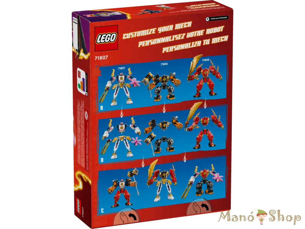 A 7 éves vagy annál nagyobb fiúk és lányok újraalkothatják a NINJAGO® Sárkányok birodalma című sorozat 2. évadának történeteit a Sora elemi csúcsrobotja (71807) kalandjátékkal. A vagány robotnak beállítható karjai és lábai vannak, amelyeket látványos csatapózokba lehet hajlítani, emellett egy hatalmas kard, egy forgó penge és egy vezetőülés, ahová beültethető a nindzsa-minifigura. Ez a még soha sem látott, testre szabható robot lehetővé teszi, hogy a gyermekek megépítsék a saját robotjukat! A leválasztható láb, kar és törzs 2 másik robot részeivel kombinálható: Cole elemi földrobotja (71806) és Kai elemi tűzrobotja (71808) (külön kaphatók). A gyerekek órákon át élvezhetik a szórakozást, miközben cserélgetik és összeillesztik a részeket, hogy egyedei akciófigurát építsenek. A nindzsajáték 2 minifigurát tartalmaz – Sora 2 katanával és egy Farkas álarcos harcos – így a gyerekek izgalmas nindzsaakciókat játszhatnak el. A készlet megépíthető a LEGO® Builder app segítségével, amely egy könnyű és intuitív építési kalandon kísér végig téged és a gyermekedet. Testre szabható, akciófigurás játék gyermekeknek – Sora elemi csúcsrobotja kalandjáték fiúknak és lányoknak, 7 éves kortól. A leválasztható lábaknak, karoknak és törzsnek köszönhetően kombinálható 2 másik robottal (külön kaphatók) Építsd meg a saját robotpáncélodat – A nindzsarajongók órákon át élvezhetik a kreatív szórakozást, miközben cserélgetik ezeknek az akciófigurás játékoknak a részeit (a szettek külön kaphatók), hogy megalkossák a saját robotfigurájukat 2 NINJAGO® minifigura – A szett tartalmaz egy Sora figurát 2 katanával és egy Farkas álarcos harcost, így a gyerekek újrajátszhatják a NINJAGO Sárkányok birodalma című sorozat 2. évadának csatáit Beállítható figura – Sora robotjának van egy vezetőülése, ahová a gyerekek behelyezhetik Sorát, van egy hatalmas kardja, forgó pengéje, a karjai és lábai pedig beállíthatók, így csatapózokba lehet hajlítani őket Nindzsaajándék – Ez a csatázós játék vidám építési és játékélményt nyújt, és remek ajándék lehet akár a hétköznapokon olyan gyermekeknek, akik imádnak akciókkal teli történeteket eljátszani Még több testre szabható robot – A gyerekek kombinálhatják Sora robotját a Cole elemi földrobotja (71806) és Kai elemi tűzrobotja (71808) szettekkel, amelyek külön kaphatók Nindzsajátékok univerzuma – A LEGO® NINJAGO® készletek sárkányokat, járműveket és templomokat tartalmaznak, és lehetővé teszik, hogy a gyerekek a nindzsahőseikkel egy kalandokkal teli fantáziavilágban kalandozzanak Méretek – A 209 elemből álló LEGO® szett tartalmaz egy 16 cm magas játék robotpáncélt