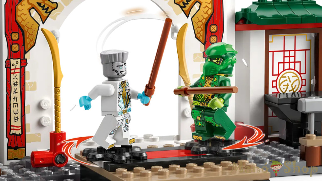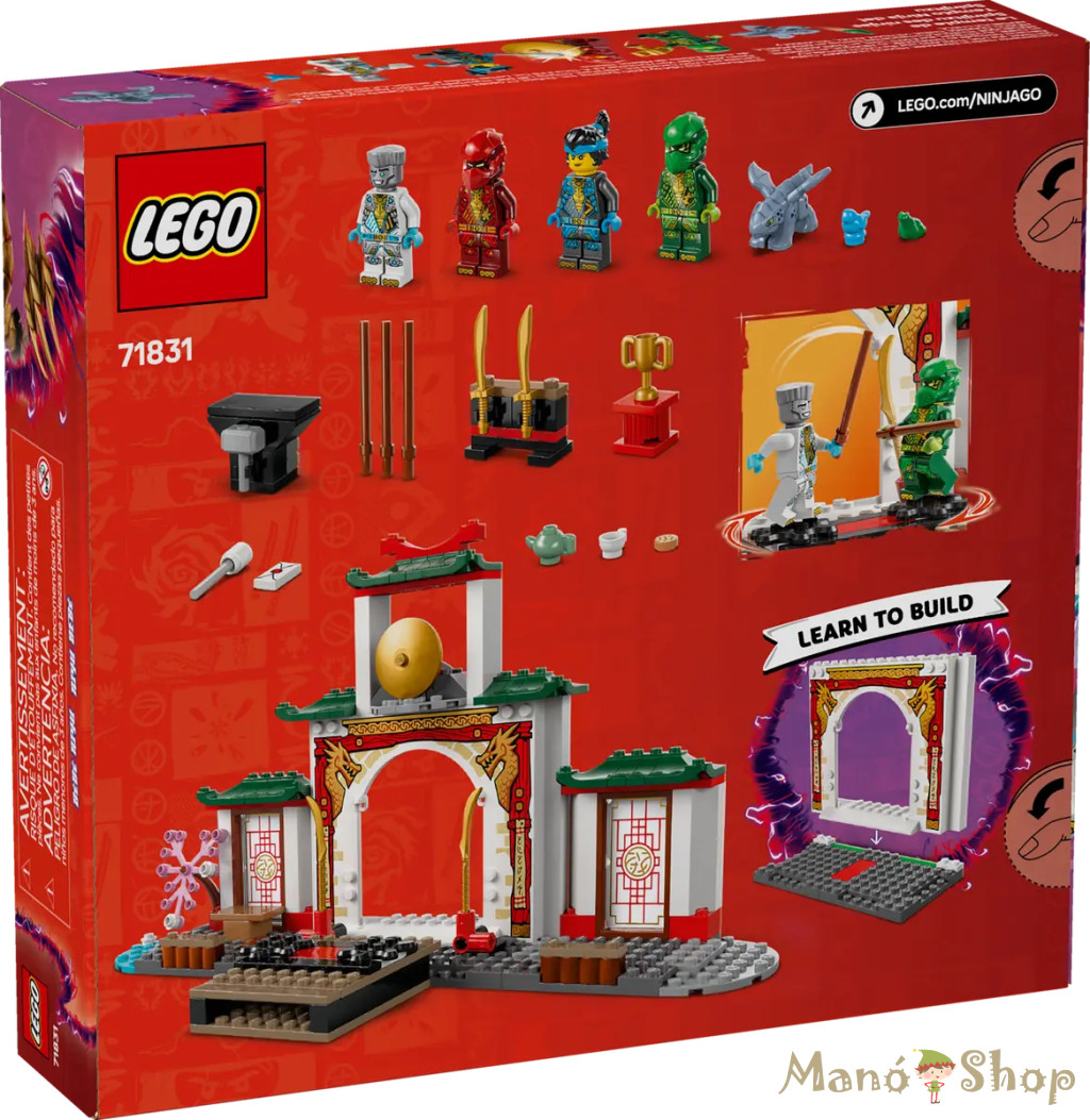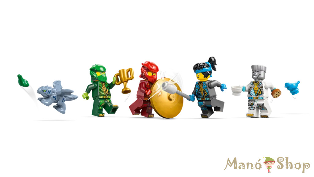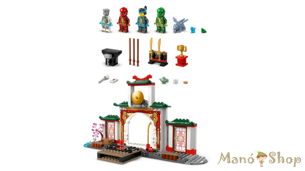 Szerezz örömet a nindzsajátékokért rajongó gyerekeknek a LEGO® NINJAGO® Spinjitzu nindzsatemplom (71831) szettel. Ezzel a játék sárkányt tartalmazó szettel a 4 éves vagy nagyobb gyerekek újra átélhetik a NINJAGO Sárkányok birodalma című sorozat 3.évadának kalandjait. A nindzsajátékkal remekül fel is ölthetik a figurák szerepét, és történeteket játszhatnak el a NINJAGO versenyhelyszínen, a kertben, a teaházban és a fegyverforgatás gyakorlására kijelölt területen. Ehhez a LEGO szetthez 4 NINJAGO minifigura tartozik: Zane, Nya, Kai, Lloyd és Kis Riyu játék sárkány, hogy a gyerekek átélhessék a nindzsaakciókat. A minifigurákat 2 forgó alaplapra lehet helyezni, ahol gigászi csatákat lehet eljátszani velük. A játékot a rengeteg kiegészítő teszi még izgalmasabbá: olyan nindzsafegyverek, mint 2 kard és 3 bot, valamint a kalapács, a madár, a béka, a trófea és a levél. Ezt a nindzsajátékot úgy terveztük, hogy vidám élményt nyújtson a 4 éves vagy nagyobb gyerekeknek, akik most felfedezik fel a LEGO építés örömét. A kalandjátékhoz tartozik egy kezdőkocka: egy részben megépített alap, amely segít a gyerekeknek gyorsan és magabiztosan építeni. Tanulj építeni, nindzsajáték gyermekeknek – A 4 éves vagy nagyobb fiúk és lányok felfedezhetik az építés örömeit, és nindzsás történeteket játszhatnak el az akciókkal teli Spinjitzu nindzsatemplom játékkészlettel Telis-tele játéklehetőségekkel – A részletgazdag nindzsatemplom egy teaházat, egy fegyverfogatásra kijelölt gyakorlóteret, egy kis kertet és egy versenyhelyszínt tartalmaz, ahol 2 forgó alaplap kap helyet 4 NINJAGO® minifigura – Zane, Nya, Kai és Lloyd nindzsaharcosok, plusz egy Kis játék sárkány, hogy izgalmas akciókat játszhassanak el a gyerekek Nindzsakiegészítők – Ez a történetekben gazdag játékszett olyan nindzsafegyvereket tartalmaz, mint a 2 kard és a 3 bot, de a kiegészítők közt még kalapácsot, madarat, békát, teáskannát, sütit, csészét, trófeát és egy levelet is találsz Születésnapi ajándék gyerekeknek – Ez a LEGO® készlet vidám építési és játékélményt nyújt, és remek születésnapi ajándék lehet a 4 éves vagy nagyobb gyerekeknek, hogy színesítse a képzelőerejüket és fejlessze a történetmesélési készségüket Fedezz fel még több gyermekeknek szóló akciójátékot – Keresd a további NINJAGO® játékkészleteket (külön kaphatók), amelyek sárkányokat, robotokat és nindzsalegendákat tartalmaznak Bevezetés a LEGO® építés világába – Az óvodáskorú gyermekeknek szóló LEGO játékkészletekkel a kicsik megtanulhatnak építeni, miközben a családtagjaikkal is megoszthatják az örömüket Méretek – 158 elemből álló LEGO® építőszett 17 cm magas, 32 cm széles és 12 cm mély nindzsatemplommal