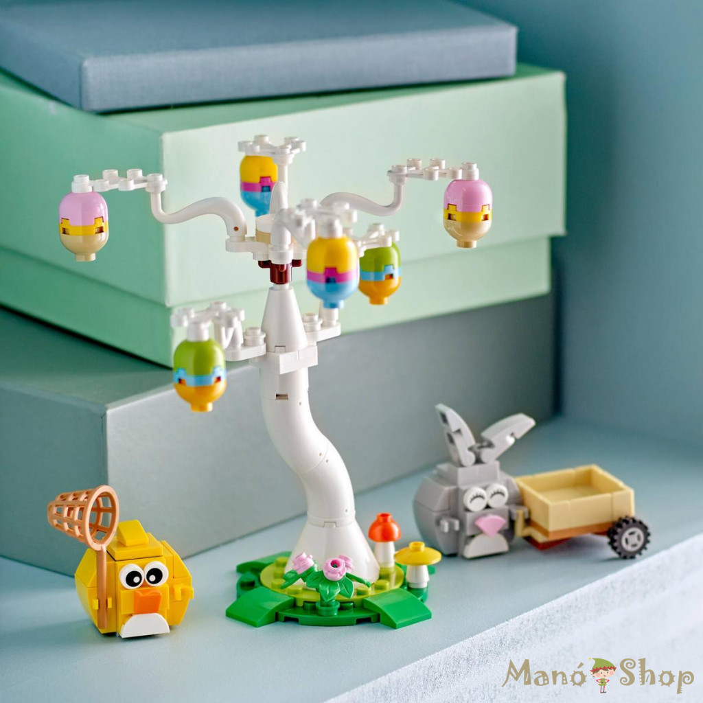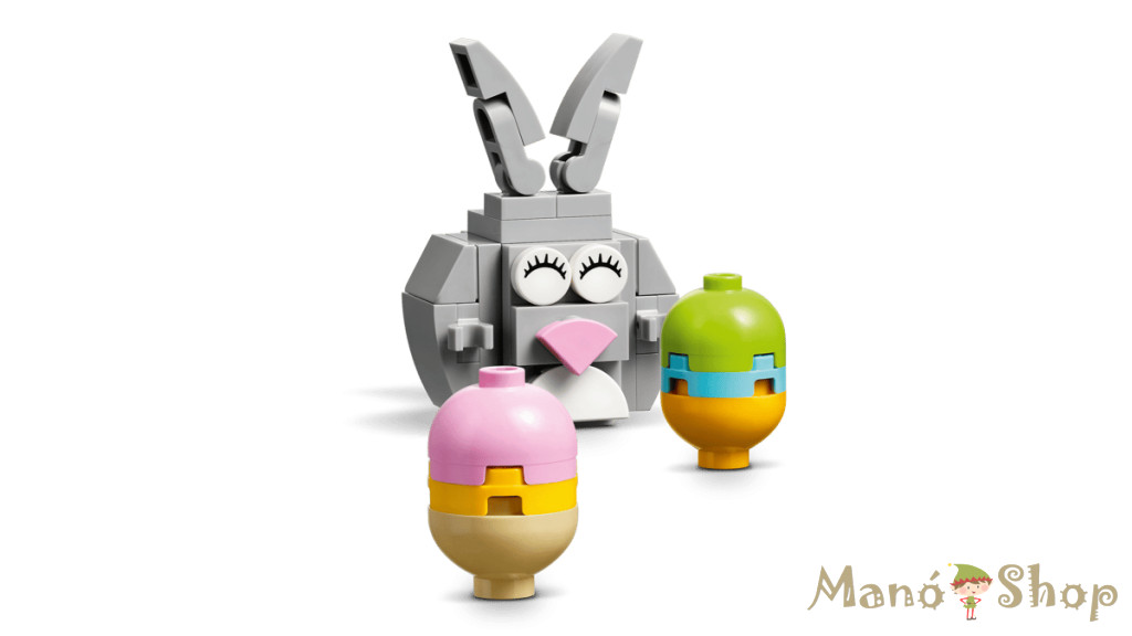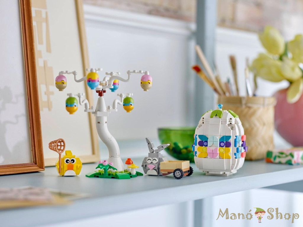Az építőkészlet szórakoztató húsvéti ajándék felnőtteknek, gyerekeknek és állatbarátoknak, valamint ideális a családoknak vagy barátoknak a közös építkezéshez. Állítsd össze a fát, a kocsit, a LEGO madárjátékot és a nyúljátékot, majd építsd meg és rögzítsd az élénk színű tojásokat a faágakhoz, hogy az állatok megtalálják. Segíts a csibének és a húsvéti nyuszinak összegyűjteni a tojásokat a háló segítségével, és a kocsiban tárolni őket.