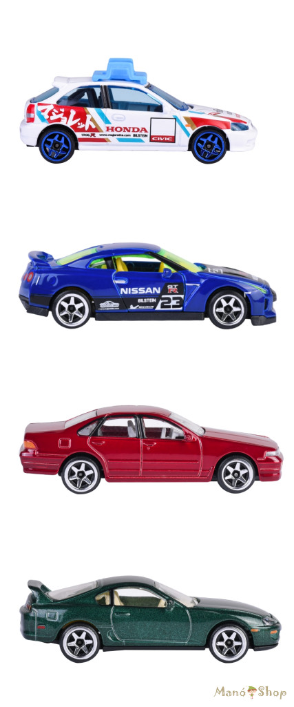 • A csomag 5 kisautót tartalmaz: 2 „Premium”, 2 „Deluxe” modell, valamint 1 extra Nissan Skyline GT-R (R34) meglepetésautó