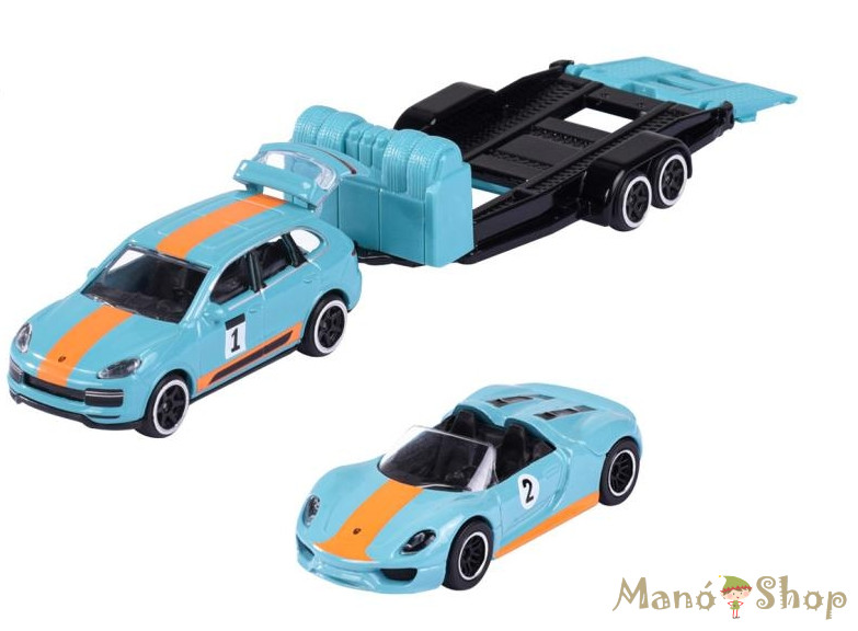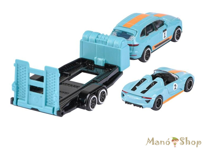 Majorette Porsche Deluxe Trailer – 3 darabos szett (2 autó + 1 utánfutó)