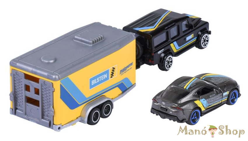 Majorette Autos Racing Trailer (3 db-os modellautó szett) - 2 fém játékautó és 1 utánfutó motorsport-dizájnnal, szabadonfutó kerekekkel, 3 éves kortól, kb. 19 cm
