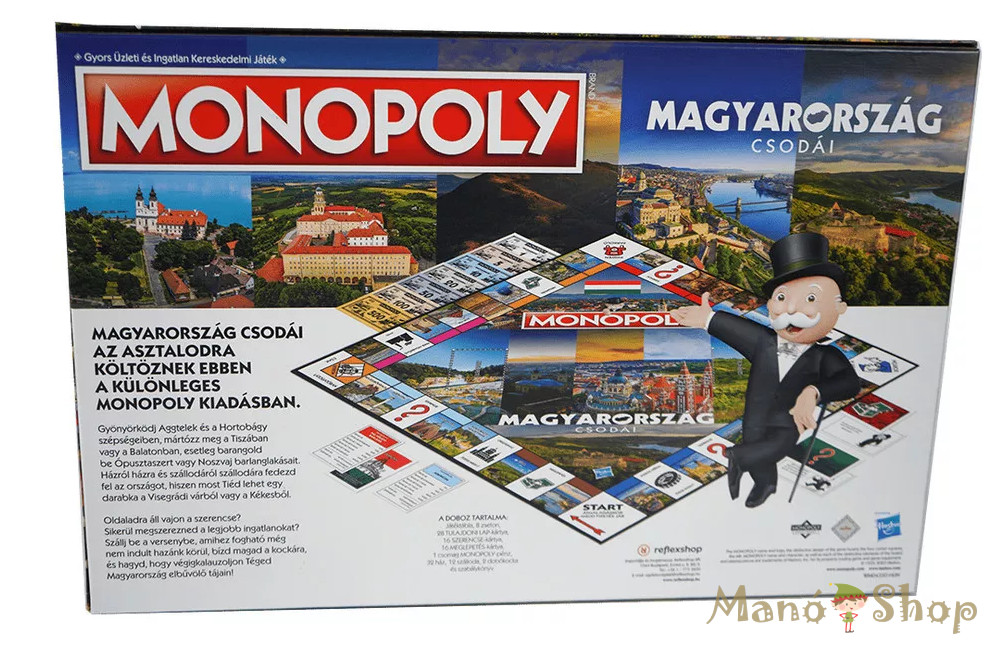 Fedezd fel a Monopoly izgalmát úgy, ahogy még sosem láttad! Legyen szó ikonikus filmekről, sorozatokról, zenekarokról vagy játékokról, minden különkiadás saját világába repít – de a cél ugyanaz: gyűjtsd be a legtöbbet és urald a pályát! Ismerős szabályok, egyedi figurák, tematikus táblák és személyre szabott kártyák teszik különlegessé az élményt. Akár a klasszikus változatot keresed, akár egy gyűjtői kiadást, itt garantált a verseny, a nevetés és a stratégia. Ilyen Monopolyban még nem volt részed: ezúttal Magyarország csodálatos tájait járhatod körbe, amelyeket természetesen nemcsak bebarangolhatod, de meg is szerezheted magadnak – természetesen csak egy-egy játék erejéig. Ha már ismered a Monopolyt, most sem fogsz meglepődni. A cél a szokásos: maradj egyedüliként játékban, miután a többi játékos csődbe ment. Ezt a következőképpen érheted el: ingatlanokat vásárolsz és begyűjtöd a bérleti díjat az odaérkező játékosoktól. Gyűjtsd össze egy-egy színcsoport minden ingatlanát, hogy házakat és szállodákat építhess, ezzel pedig növelheted a beszedhető bérleti díjat. Minél nagyobb részét uralod a táblának, annál jobbak az esélyeid, de vigyázz, bármikor felforgathatja az állást egy meglepetés- vagy szerencsekártya! A körödben: Dobj mindkét kockával. Lépj a zsetonoddal a táblán az óramutató járása szerint, a dobásnak megfelelően. Cselekedj attól függően, hogy melyik mezőre érkeztél. Ha a lépésed a START mezőn ér véget, vagy keresztülvisz rajta, vegyél fel 200 Monopoly dollárt a Banktól. Ha mindkét kockával azonosat dobtál, lépésed után ismételd meg az 1-4 pontokat. (Vigyázz! Ha egymás után háromszor dobsz duplát, akkor Irány a börtön.) Amikor végeztél a lépéssel vagy művelettel, add át a kockát a tőled balra lévő játékosnak. Így folytatódik a játék, míg valaki egyedüliként bent nem marad. A doboz tartalma: 1 játéktábla, 8 zseton, 28 tulajdonilap-kártya, 16 szerencsekártya, 16 meglepetéskártya, 1 csomag Monopoly-pénz, 32 ház, 12 szállod, 2 dobókocka, 1 szabályfüzet Játékos: 2-6 fő Játékidő: 60 perc Kor: 8+ év *A termékfotók kizárólag illusztrációs célt szolgálnak. A termék tényleges megjelenése – beleértve a színeket, mintákat, részleteket és kiegészítőket – a gyártás során eltérhet a képeken láthatótól. A gyártó a változtatás jogát előzetes értesítés nélkül fenntartja.*