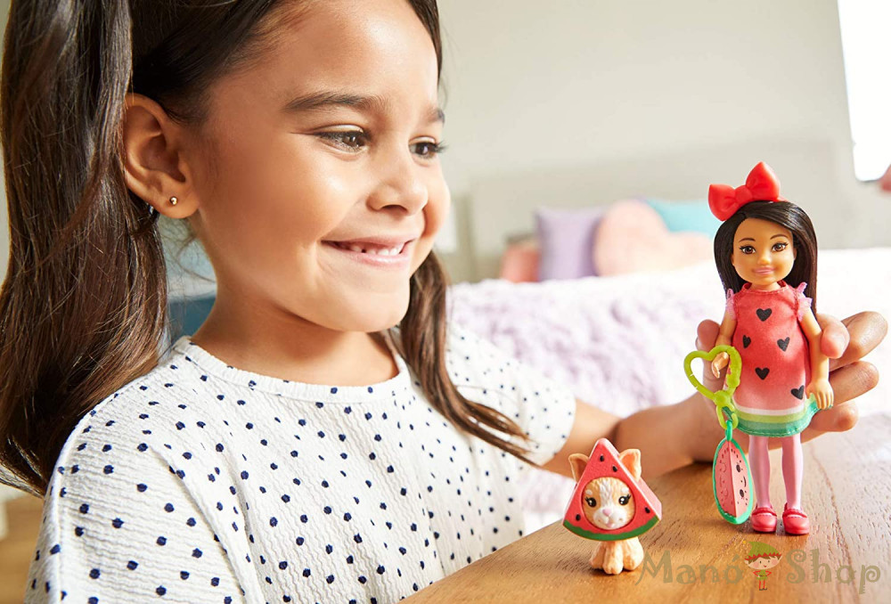 Chelsea és barátai arra inspirálják a kis álmodozókat, hogy felfedezzék a világot. A gyerekek sokféle mókás történetet eljátszhatnak a 15 cm méretű Chelsea babákkal, melyek tematikus ruhákat viselnek. Választhatsz unikornis, dinnye vagy cica jelmezt. Minden babának van fejdísze (hajráf vagy masni) és felöltöztetett kisállat barát tartozik hozzá, akinek jelmeze az édes mesélést inspriálja. A hozzá tartozó kulcskarikával Chelsea baba könnyen a hátizsákra vagy a ruhára akasztható – magaddal viheted az öltöztetős játékot és megmutathatod a barátaidnak.