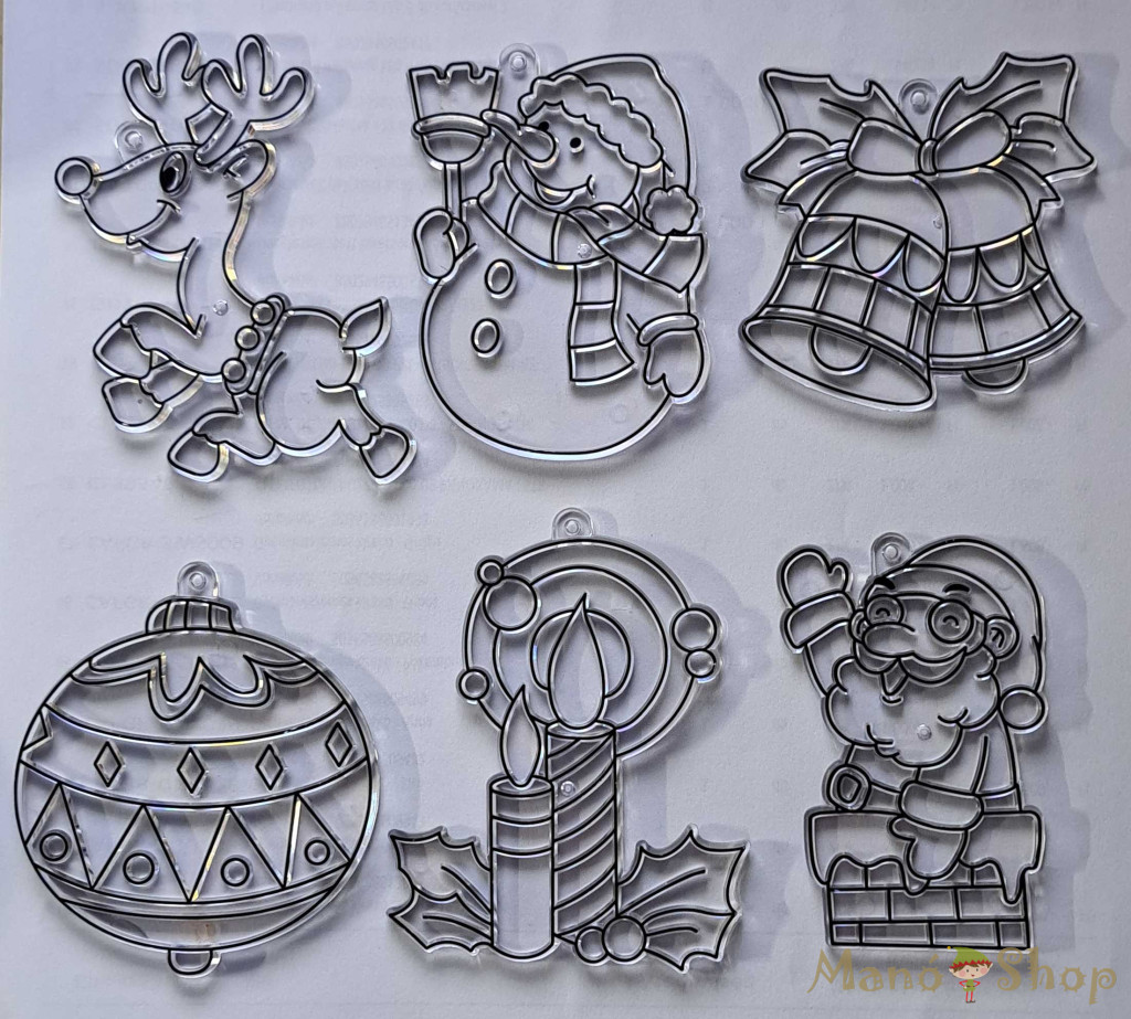 Tartalma: 6db üvegfestékkel festhető karácsonyi forma/függeszték